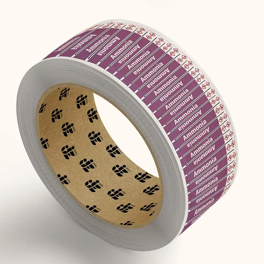De ammonia leidingmarkering stickers – op rol kun je gebruiken om aan te geven dat in deze leiding een soort base stroomt. Met deze leidingmarkering geef je aan dat het gaat om ammonia. De ammonia leidingmarkering sticker op rol is verkrijgbaar in twee verschillende formaten (zie specificaties hieronder) en is gemaakt van zelfklevende folie met laminaatlaag. Hierdoor kun je altijd een sticker kiezen die bij jouw situatie past. De ammonia leidingmarkering sticker op rol heeft een rechthoekige vorm en is paars met wit en zwart van kleur.