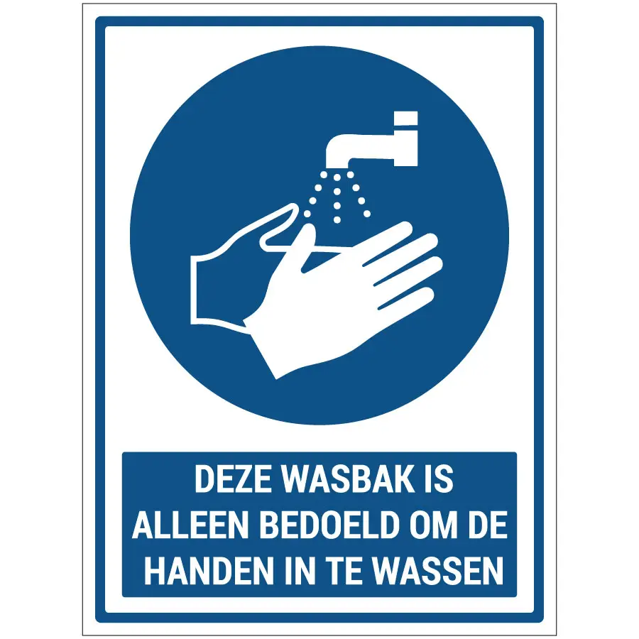 Het pictogram deze wasbak is alleen bedoeld om handen in te wassen met tekst geeft aan dat je hier verplicht de wasbak moet gebruiken om je handen in te wassen. Dit pictogram geeft dit duidelijk aan met behulp van het symbool van handen wassen onder een kraan en de tekst deze wasbak is alleen bedoeld om handen in te wassen op een blauwe achtergrond. Hierdoor weet iedereen welke regels verplicht zijn op deze plek. Het gebodspictogram voor deze wasbak is alleen bedoeld om handen in te wassen is gemaakt conform normen voor veiligheidspictogrammen. Zo zorg je ervoor dat voor iedereen duidelijk is wat met het symbool bedoeld wordt.