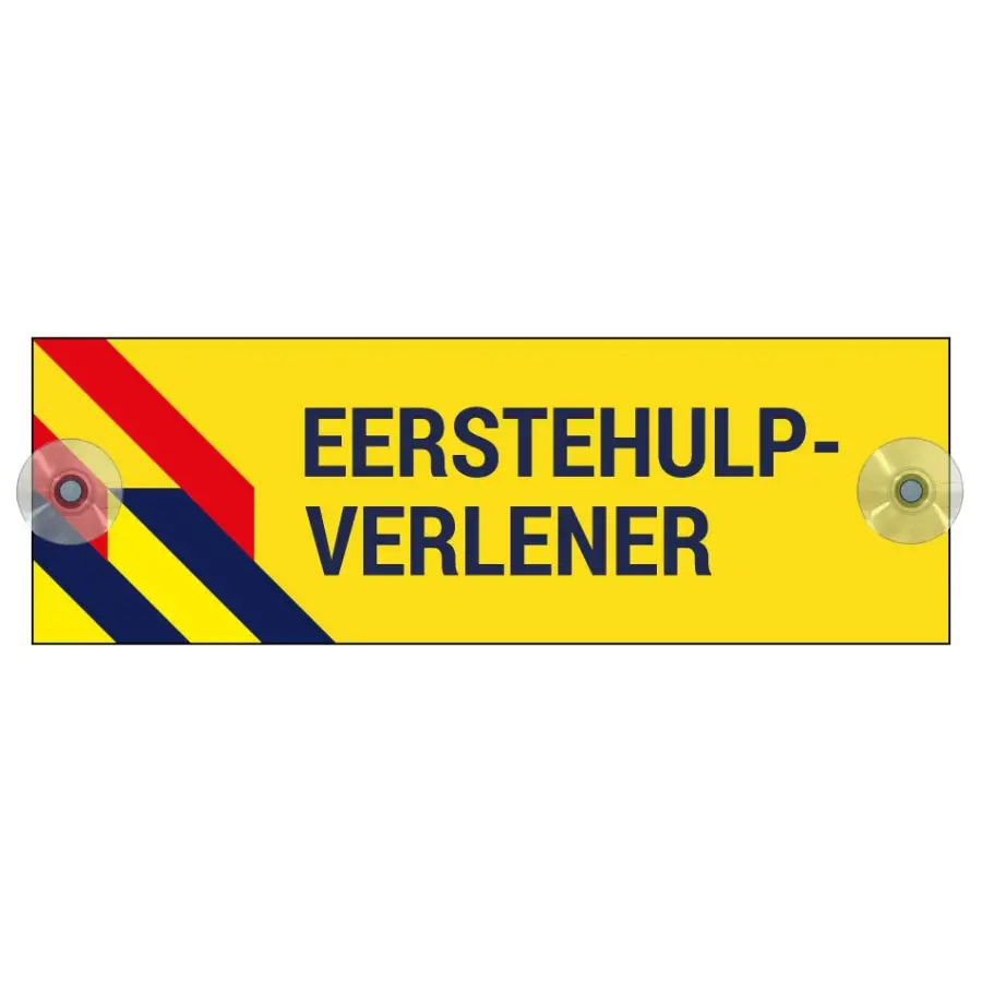 Het pictogram eerstehulpverlener kun je gebruiken om te laten zien dat je in geval van nood eerste hulp kunt verlenen. Dit pictogram geeft dit duidelijk aan met behulp van de blauwe tekst eerstehulpverlener op een gele achtergrond met rode en blauwe strepen. Door de meegeleverde zuignapjes en twee boorgaten in het bord kun je het gemakkelijk ophangen in je auto, bus of vrachtwagen.