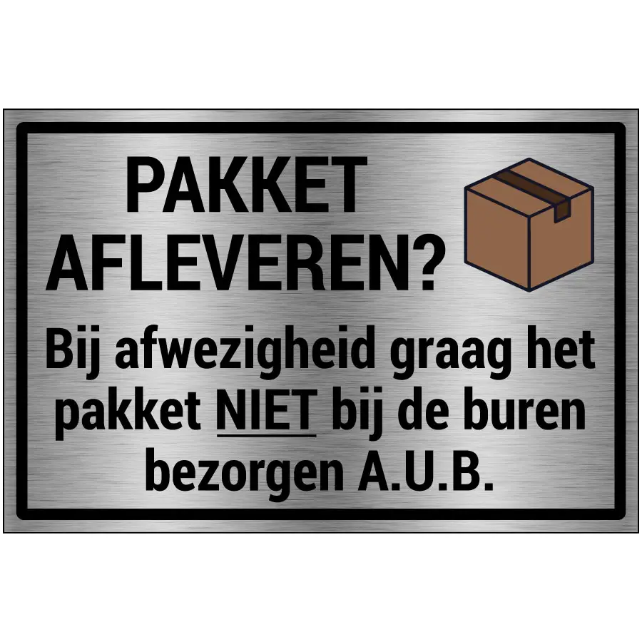Het pakket niet bij buren bezorgen bord – brushed aluminium materiaal – grijs zwart is de perfecte oplossing wanneer je duidelijk aan de pakketbezorger wilt laten zien dat pakjes niet bij de buren bezorgd mogen worden. Dit bord is verkrijgbaar in verschillende formaten, waardoor het bord goed zichtbaar is voor pakketbezorgers. Daarnaast heeft het bord een stijlvol ontwerp door de grijs met zwarte kleur. Hierdoor past het goed in elke omgeving.