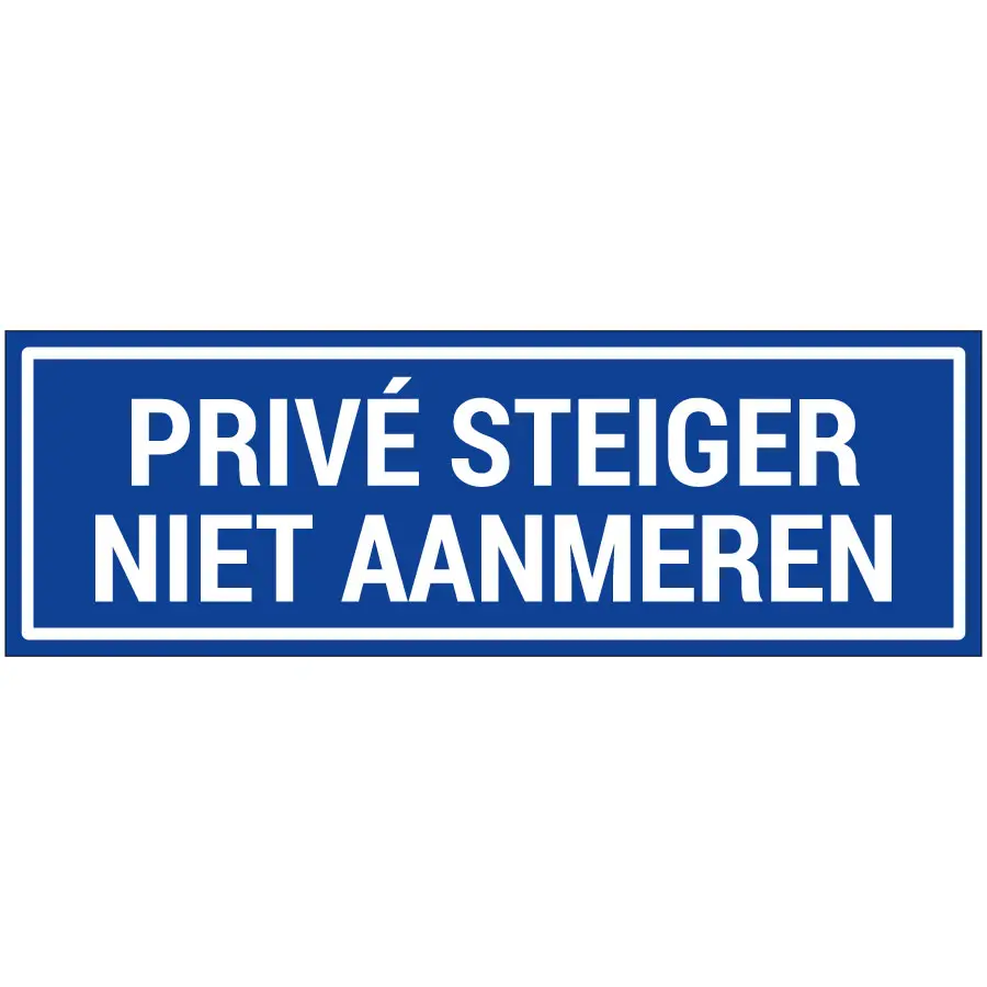 Het privé steiger niet aanmeren bord kun je gebruiken om te laten zien dat dit een privé steiger is waar je niet mag aanmeren. Hiermee geef je duidelijk aan wat de regels zijn op het water of aan de waterkant. Het privé steiger niet aanmeren bord is verkrijgbaar in verschillende formaten en materialen. Hierdoor kun je altijd een bord kiezen dat bij jouw situatie past. Het privé steiger niet aanmeren bord heeft een rechthoekige vorm en is blauw met wit van kleur.
