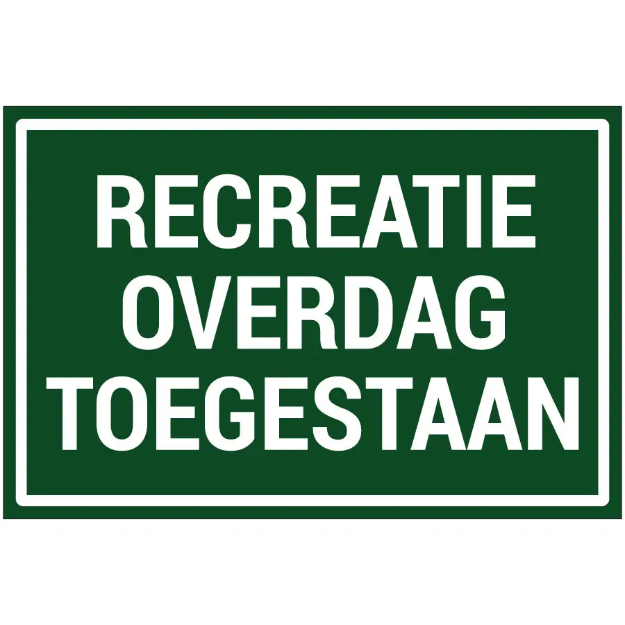 De recreatie overdag toegestaan sticker kun je gebruiken om te laten zien dat je hier overdag mag recreëren. Hiermee kun je mensen gemakkelijk informeren. De recreatie overdag toegestaan sticker is verkrijgbaar in verschillende formaten en is gemaakt van zelfklevende folie. Hierdoor kun je altijd een sticker kiezen die bij jouw situatie past. De recreatie overdag toegestaan sticker heeft een rechthoekige vorm en is donkergroen met wit van kleur.