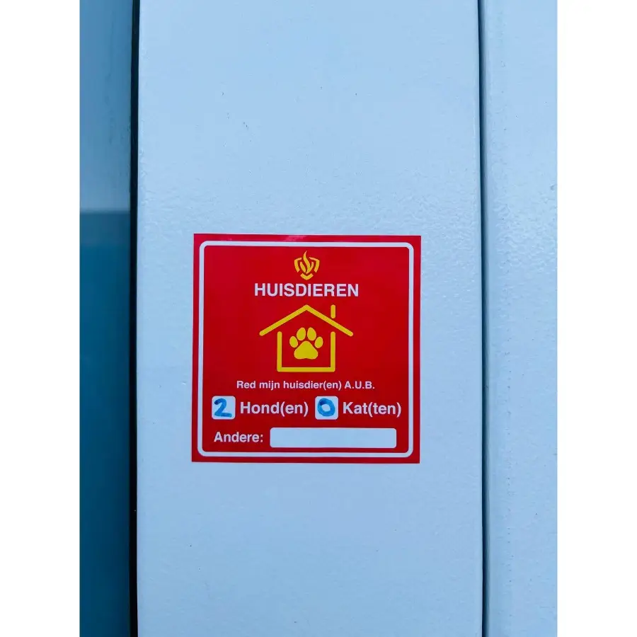 Sinds 2021 wordt de huisdieren sticker brandweer gebruikt om aan te geven hoeveel huisdieren er aanwezig zijn in een huis of gebouw. Mensen die bij de brandweer actief zijn leggen namelijk een eed af om niet alleen mensen, maar ook dieren uit gebouwen te redden die in brand staan. Echter, zijn dieren vaak een stuk minder duidelijk waar te nemen dan mensen. Deze sticker geeft duidelijk aan hoeveel katten, honden of andere dieren er aanwezig zijn in het huis.