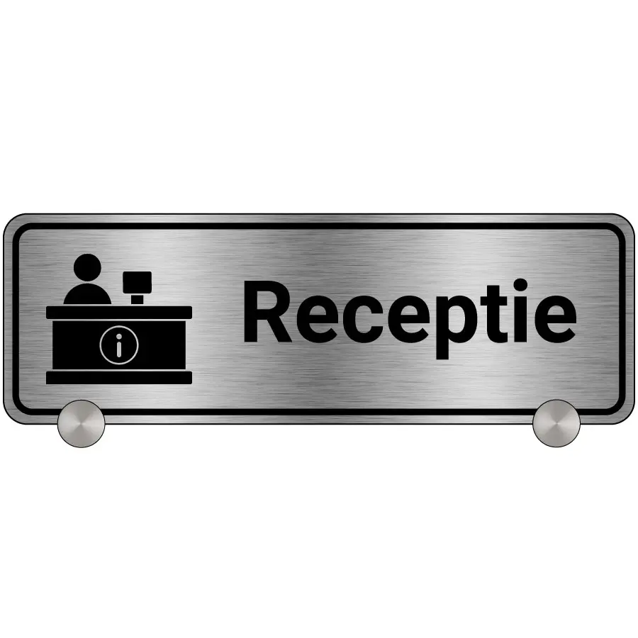 Het tafelbordje receptie kun je gebruiken om te laten zien dat dit de receptie is. Hiermee kun je mensen gemakkelijk informeren. Het tafelbordje receptie is verkrijgbaar in een formaat van 21 bij 7 cm en is gemaakt van brushed aluminium materiaal. De hoeken van het bordje zijn afgerond voor een hoogwaardige uitstraling en het tafelbordje wordt geleverd inclusief tafelstandaard met zijgrip. Hier kun je het bordje gemakkelijk in plaatsen en rechtop op tafel zetten.