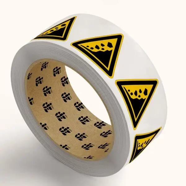De vallende rotsen waarschuwingsstickers op rol – W078 kun je gebruiken om te laten zien dat er sprake is van gevaar voor vallende rotsen. Hiermee attendeer je mensen op mogelijk gevaarlijke omstandigheden. De gevaar voor vallende rotsen waarschuwingsstickers op rol zijn verkrijgbaar in verschillende formaten en zijn gemaakt van pvc-vrije zelfklevende folie. Door te kiezen voor stickers op rol profiteer je van een aantrekkelijke prijs per sticker. De waarschuwingssticker voor vallende rotsen heeft een driehoekige vorm en is geel met zwart van kleur.