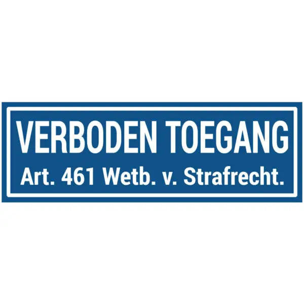 Het pictogram verboden toegang art. 461 geeft aan dat je dit terrein niet mag betreden volgens artikel 461 van het wetboek van strafrecht. Dit pictogram geeft dit duidelijk aan met behulp van de tekst verboden toegang Art. 461 Wetb. v. Strafrecht op een blauwe achtergrond. Hiermee geef je duidelijk aan dat toegang niet is toegestaan voor onbevoegden. Verder is dit pictogram gemaakt volgens standaarden voor veiligheidspictogrammen. Zo kan iedereen snappen wat er met het symbool bedoeld wordt.